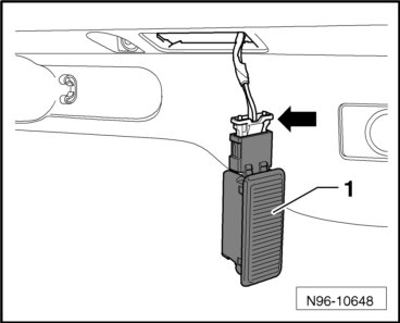 - Disconnect the harness connector - arrow - and remove the glove compartment lamp - 1 -.