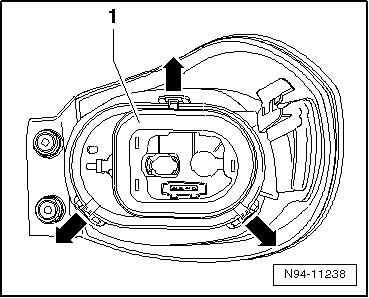 - Push the tail lamp retaining tabs in - direction of arrow - and remove the bulb holder - 1 - from the tail lamp.