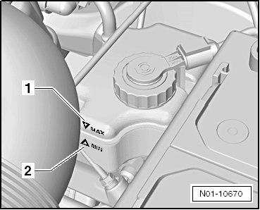 If brake fluid level is below MIN mark - 2 -, check brake system for leaks before adding brake fluid.