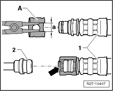 The clip must be seated completely in the groove on the coupling - 2 - and the connection - 1 -. Dimension - a - should be a maximum of 5 mm.