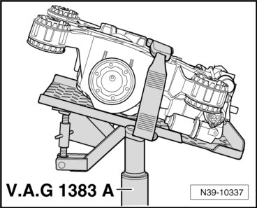 - Support the final drive using the engine/transmission jack (V.A.G 1383 A) and use the strap to secure it to the universal support to prevent falling.