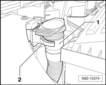 - Unclip the connecting pipe with filler tube - 1 - from the bracket - 2 -.