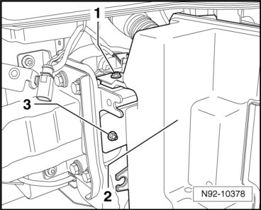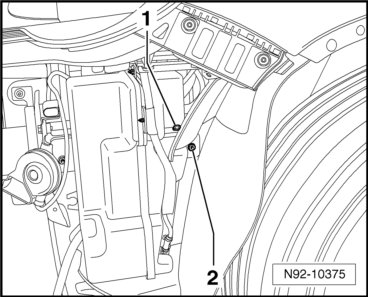 - Remove the reservoir for the windshield and headlamp washer system - 2 -, while being careful of connected wires, and lay it to the side.