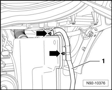 - Unclip the wiring harness - 1 - from both fasteners - arrows - on the washer fluid reservoir.