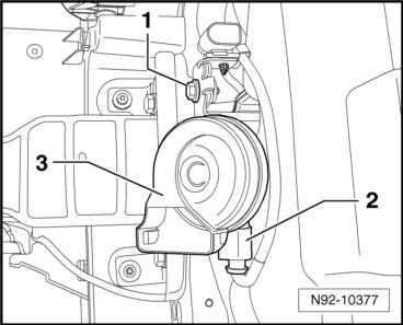 - Remove the mounting screw - 1 -, disconnect the unlatch the harness connector - 2 - and remove the horn - 3 -.