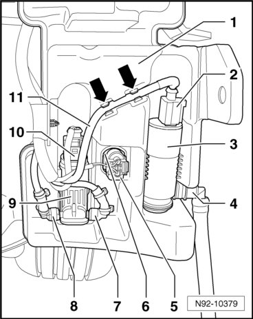 - Remove the reservoir - 1 - and the connecting pipe with filler tube from the vehicle.