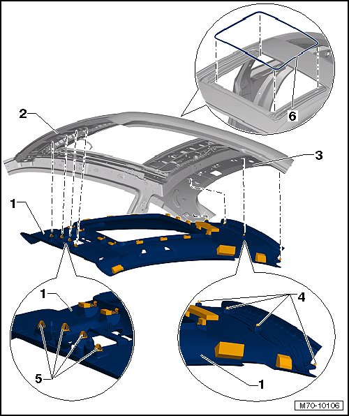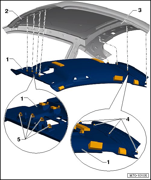 - Carefully loosen the clips - 4 - from the rear roof crossmember - 3 -.