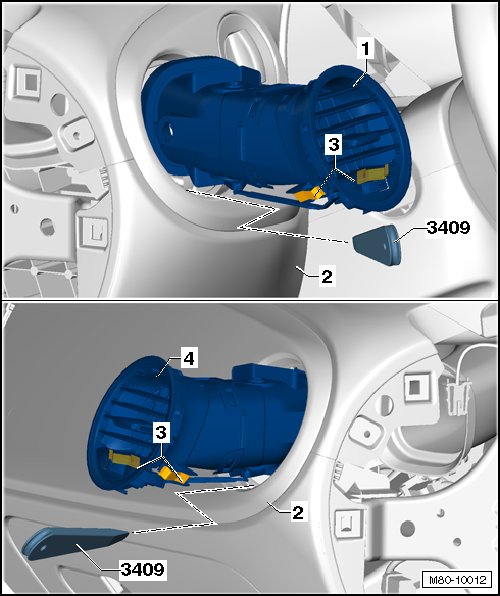 - Reach into the side opening of the instrument panel - 2 - with one hand and push the side air vent- 1 - or - 4 - slightly in the direction of the vehicle interior. Loosen the side air vents - 1 - or - 4 - by hand or with the (3409) from the outside, while supporting them with the retainers - 3 -.