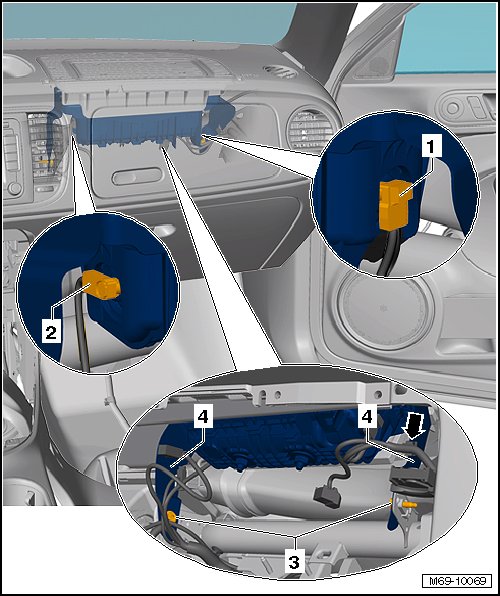 - Disconnect the wiring harness - 1 - from the front passenger airbag unit.