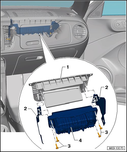 If the housing for the front passenger airbag unit - 4 - is plastic, then use locking compound D 197 300 A2 when installing the screws - 3 - (9 Nm).