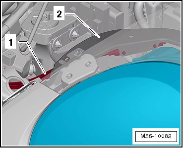 - Unclip the cable coupling - 1 - from the mount - 2 - above the headlamp on the driver side.