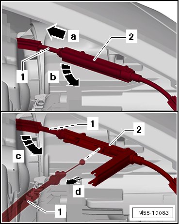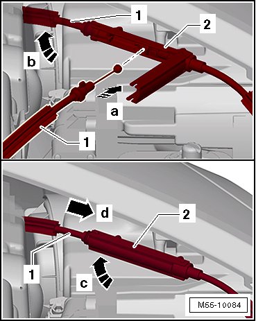 - Move the cable - 1 - in direction of the - arrow c - and remove it from the cable coupling - 2 - - arrow d -.