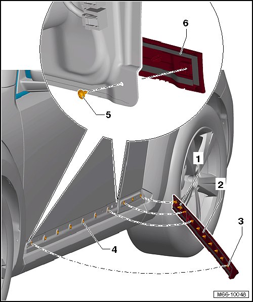 - Heat the adhesive tape on the corresponding body side molding - 1 - or - 2 - with the hot air blower (V.A.G 1416).