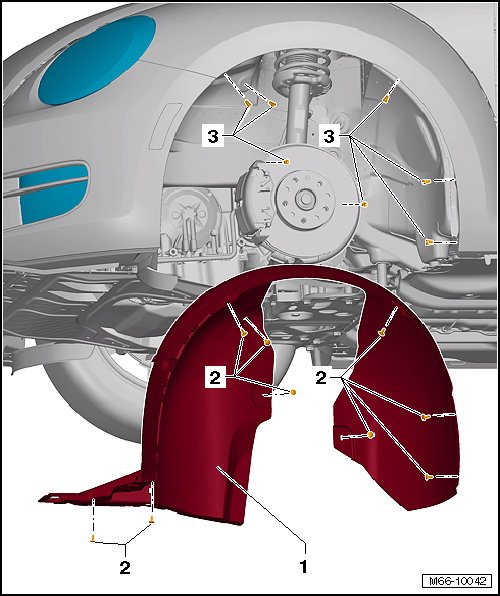 - Insert the wheel housing liner - 1 - in the fender and adjust it the installed position.