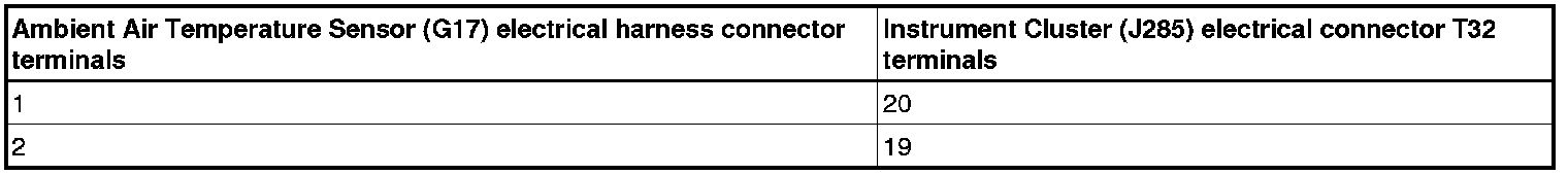 - Using a multimeter, check the Ambient Air Temperature Sensor (G17) electrical harness connector terminals 1 and 2 to the Instrument Cluster electrical harness connector for an open circuit or a short, refer to the wiring diagram. Refer to Wiring Diagrams for pin locations.