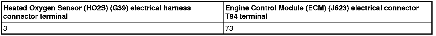 - Using a multimeter, check the Heated Oxygen Sensor (HO2S) (G39) electrical harness connector terminal 3 to the Engine Control Module (ECM) (J623) electrical harness connector T94 terminal 73 for an open circuit. Refer to Wiring Diagrams for pin locations.