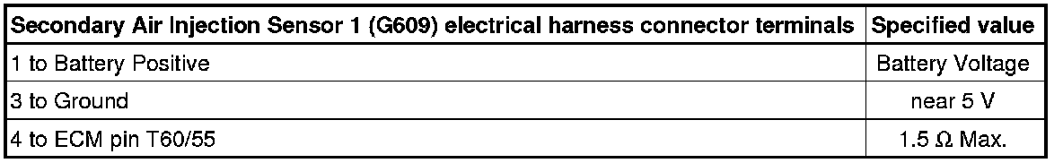 - Using a multimeter, check the Secondary Air Injection Sensor 1 (G609) electrical harness connector for voltage using the chart below.