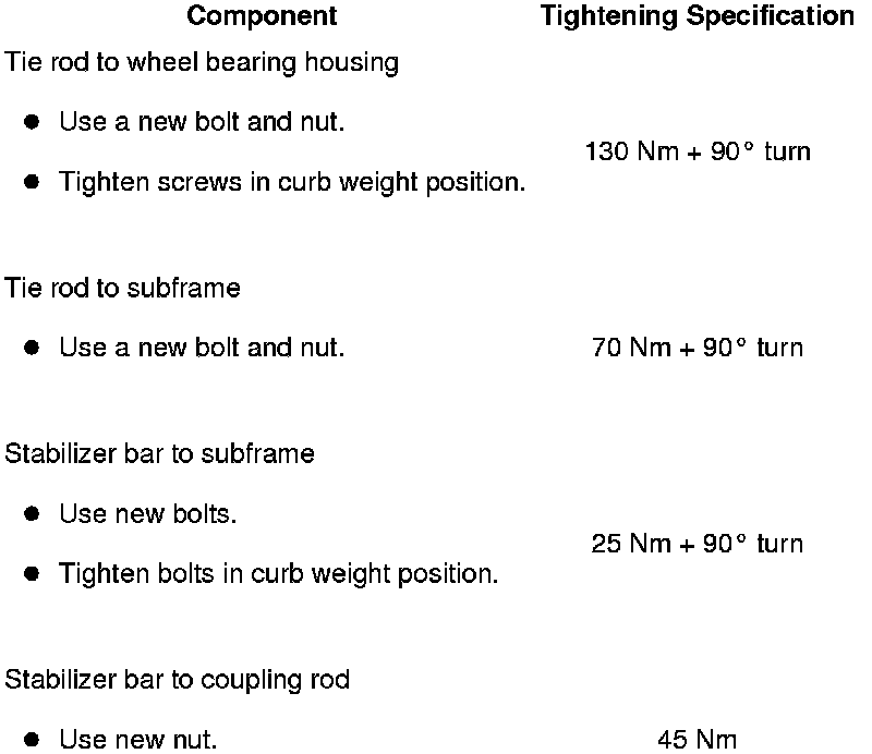 - Perform an axle alignment. Refer to => [ Wheel Alignment, Vehicles with Multi-Link Rear Suspension ] Wheel Alignment, Vehicles with Multi-Link Rear Suspension.