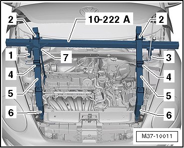 - Support the engine and transmission using the spindle (10 - 222 A /11) (- 11 -). Do not lift yet.