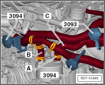 - Open the spring clamps - A - and pull the coolant hoses - B and C - off the cooler.