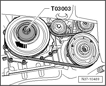 - Rotate the engine in engine rotation direction - arrow - 60° further using the crankshaft adapter (T03003).