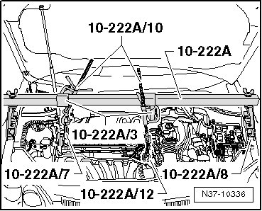 - Remove the transmission mount bracket - A -. Lower the engine and transmission slightly using the spindles on the engine support bridge (10-222 A).