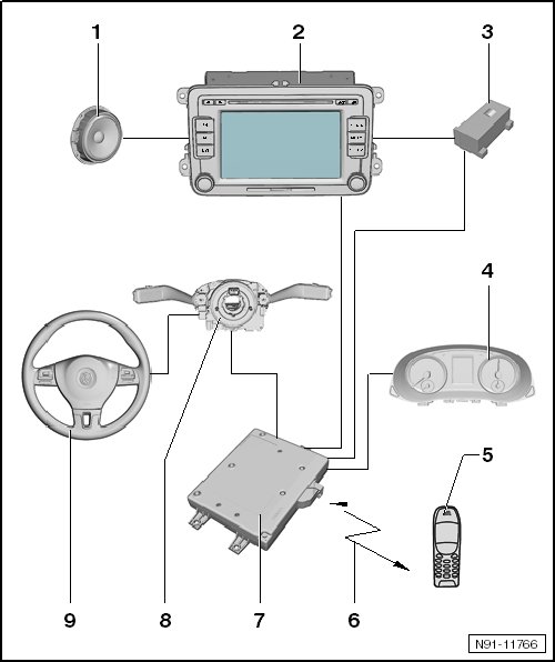 • Removing and installing, refer to => [ Cell Phone Operating Electronics Control Module (J412) ] Cell Phone Operating Electronics Control Module (J412).