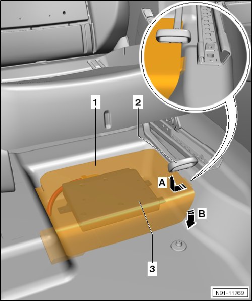 - Push the module carrier - 1 - for cell phone operating electronics control module - 3 - toward the outside in direction of arrow - A - and lift it on the tunnel in direction of arrow - B -.