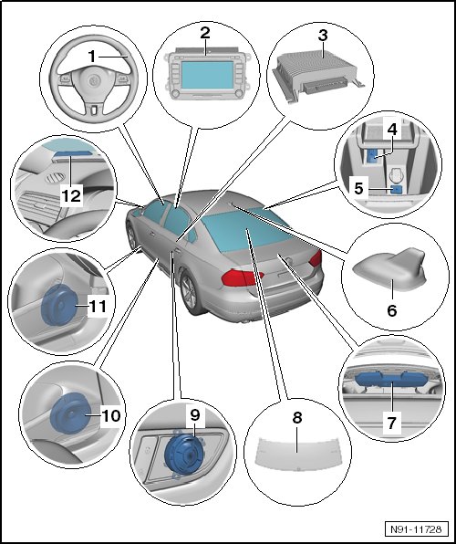 6 - Roof antenna -RX5- with GPS antenna -R50- and Satellite tuner antenna -R172-
