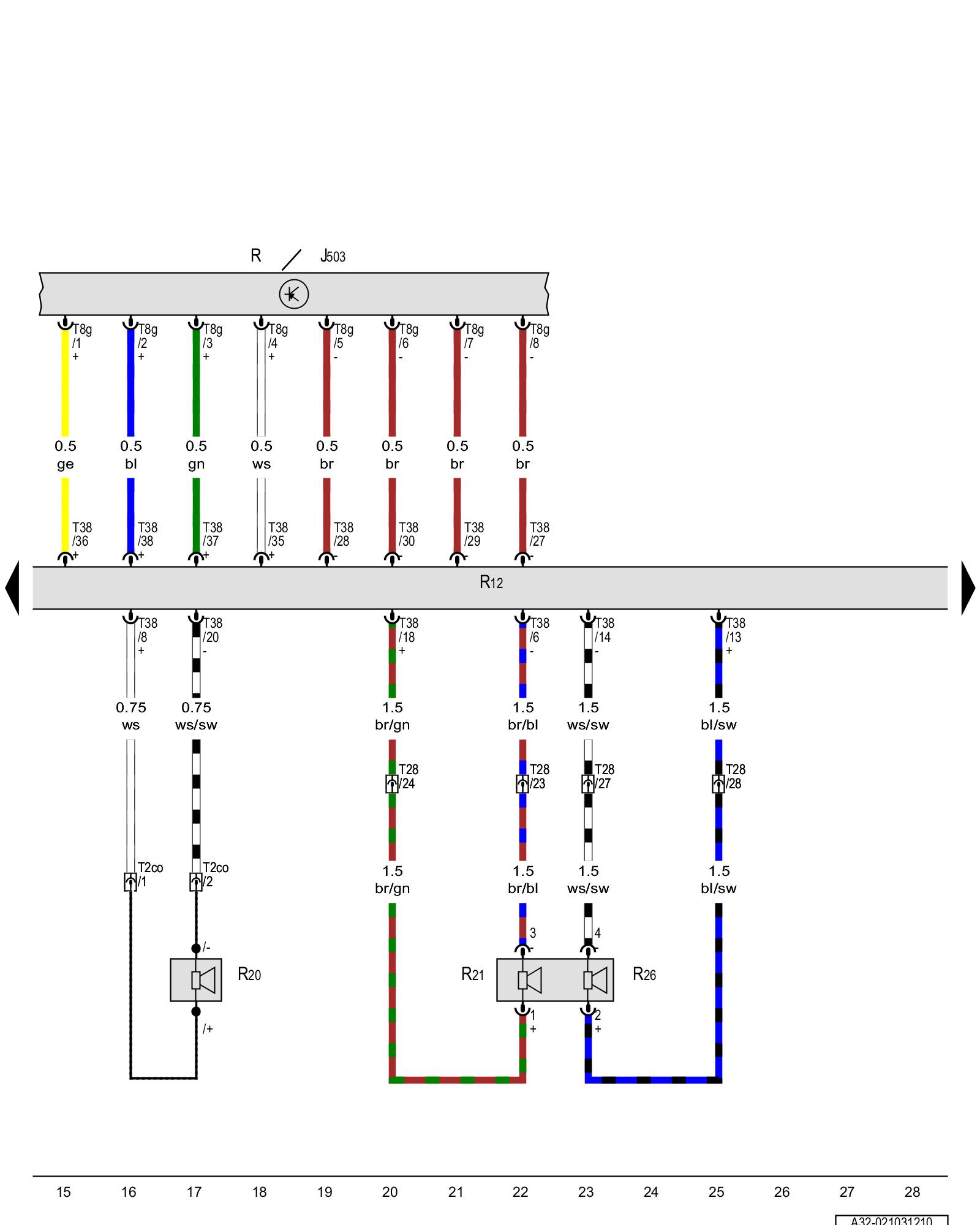 Radio/navigation display unit control module, Radio, Amplifier, Left front treble speaker, Left front bass speaker, Left front mid-treble speaker