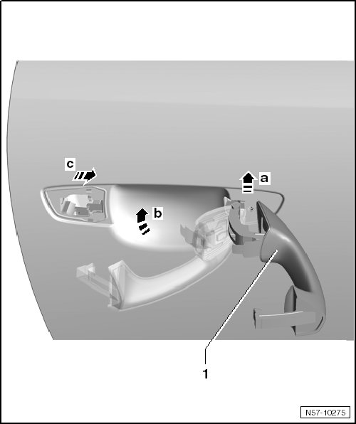 - Pull the door handle - 1 - slightly to the rear - arrow a - and out of the mount.
