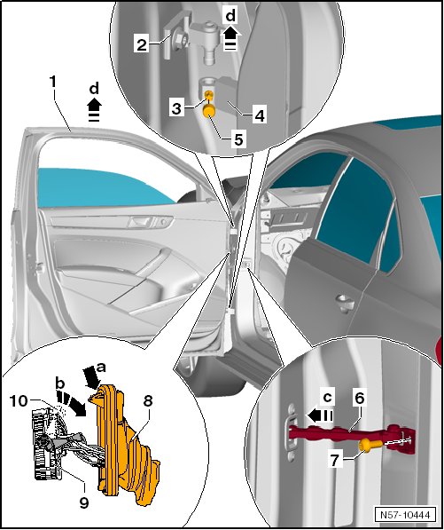 - Lift the front door - 1 - with the hinges - 2 - upward - arrow d - out of the hinges - 4 -.