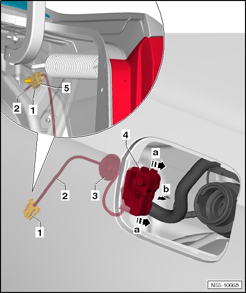 - Remove the fuel filler door unlock motor (V155) - 4 - from the fuel filler door cup - arrow b -.