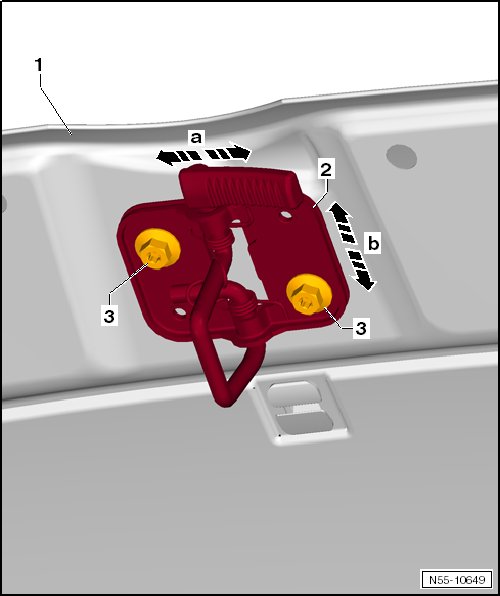 - Adjust the hood catch - 2 - on the hood - 1 - inside the oversized holes.