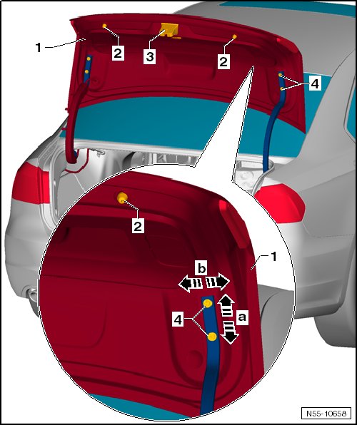 - Loosen the left and right bolts - 4 - and adjust the rear lid - 1 - in the oversized holes on the hinge - arrows a - and - arrows b -.