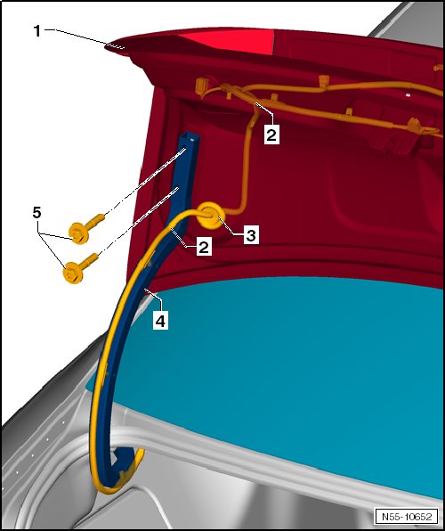 - Remove the electric wires - 2 - with the rubber grommet - 3 - out of the rear lid - 1 -.