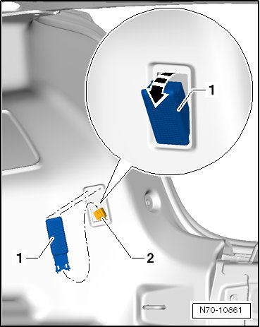 - Loosen the right luggage compartment lamp (W35) - 1 - in - direction of arrow - and remove it from the luggage compartment trim panel. Disconnect the connector - 2 - at the same time.
