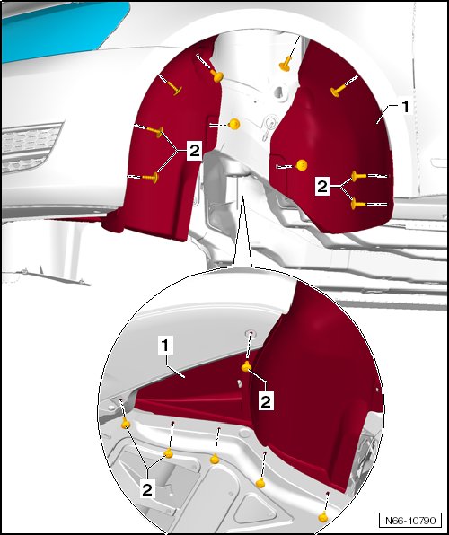 - Tighten the front wheel housing liner - 1 - at all the attaching points. Refer to => [ Front Wheel Housing Liner Assembly Overview ] Front Wheel Housing Liner Assembly Overview.