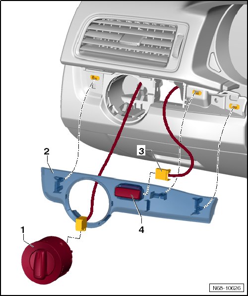 - Remove the instrument panel trim on the driver side - 2 -. Disconnect the wiring - 3 - from the instrument panel illumination dimmer switch (E20) - 4 -.