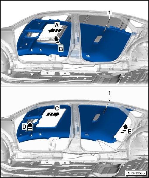 - Remove the roof trim panel - 1 - from the vehicle carefully through the front passenger door.