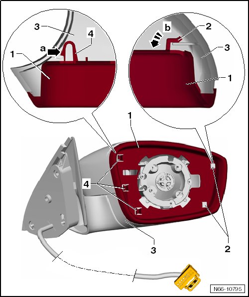 - Press the trim - 1 - onto the mirror base - 3 - until the hooks- 4 - click into place.