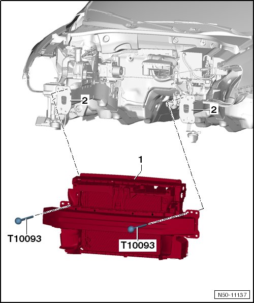 - Together with a second technician, remove the guide rods (T10093) on the left and right longitudinal members - 2 - and remove the lock carrier - 1 -.