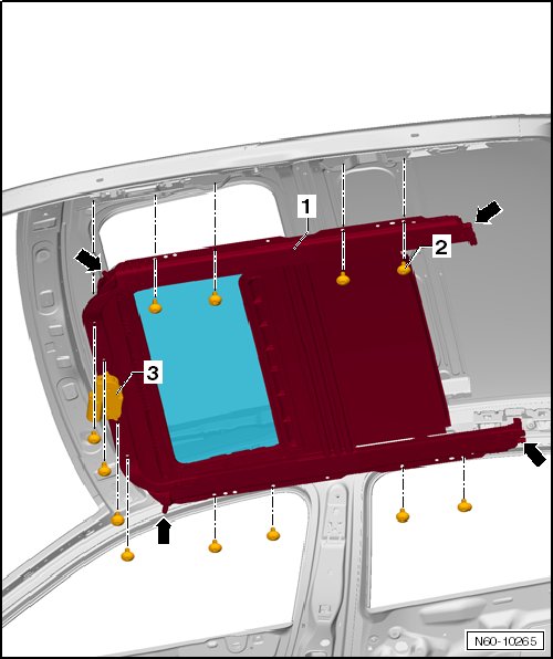 - Line up the assembly unit - 1 - over the two cylindrical pins at the front right 12 mm - 4 - and rear left 10 mm - 3 - inside the roof.
