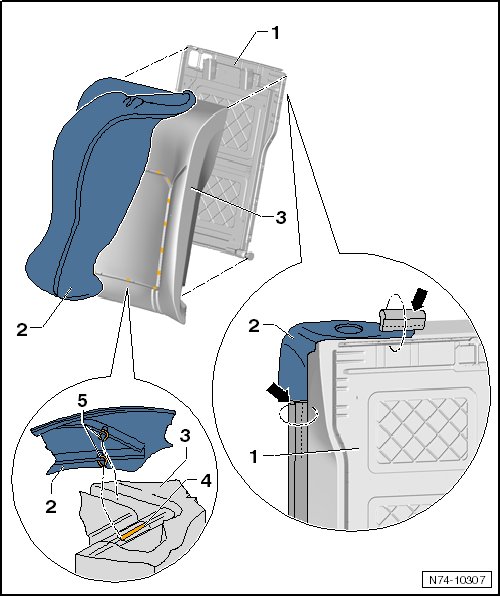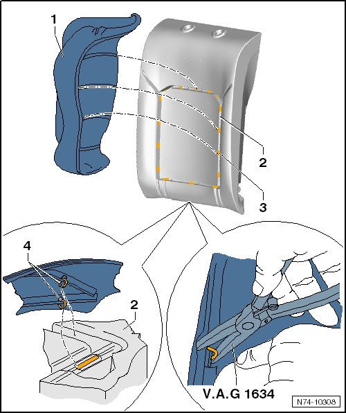 - Attach the cover - 1 - to the cushion - 2 - with new upholstery clips - 4 - at the shown locations - 3 - using the upholstery clip pliers (V.A.G 1634).