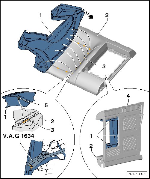 - Attach the cover - 1 - to the cushion - 2 - with new upholstery clips - 5 - at the shown locations - 3 - using the upholstery clip pliers (V.A.G 1634).