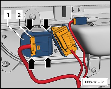 - Open the tabs - arrows - and remove the switch module - 1 - from the door trim panel.