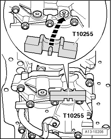 - Lock the balance shaft in place using the locking tool (T10255). Rotate the balance shaft if necessary.