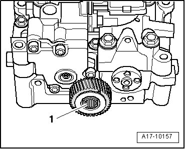 - Press the intermediate sprocket - 3 - forcefully in the - direction of the arrow - into the spur gear splines - 2 - and the balance shaft chain sprocket - 1 - using a wooden block if necessary.