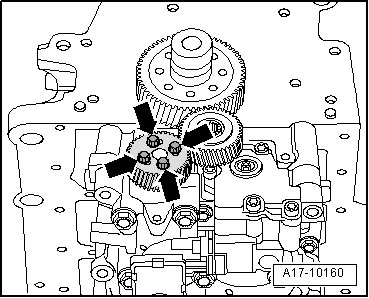 - Tighten the bolts - arrows - for the balance shaft chain sprocket.