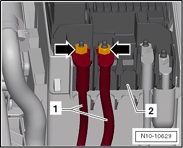 - Remove the nuts - arrows - and the battery positive cables - 1 - from the E-Box - 2 -.